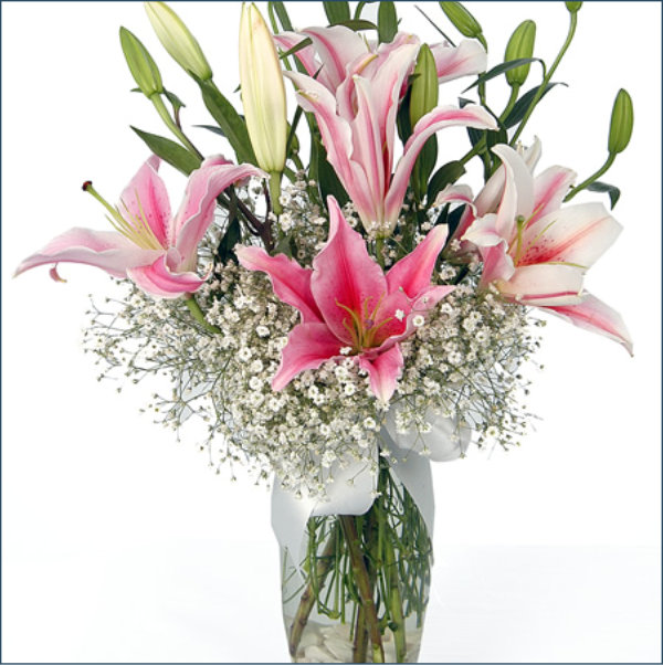 Cam vazo içerisinde süslenmiş 13 gül, lilyum çiçekler ve cipsolar