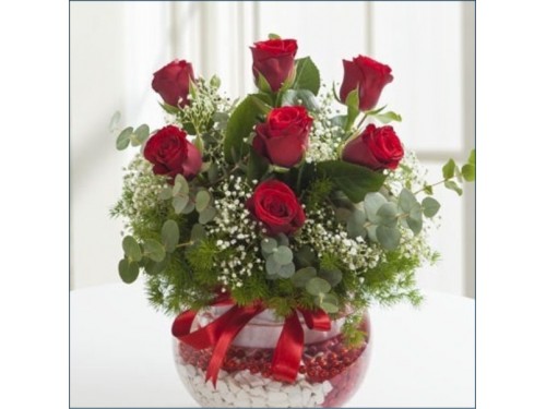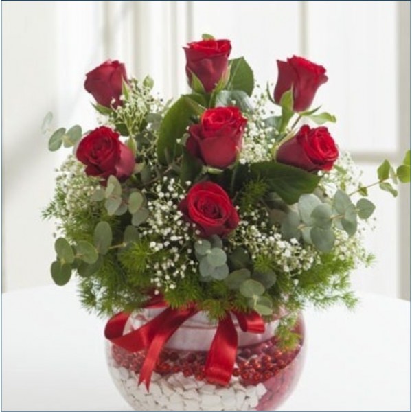 Cam fanus içerisinde 7 kırmızı gül, taşlar ve cipsolar