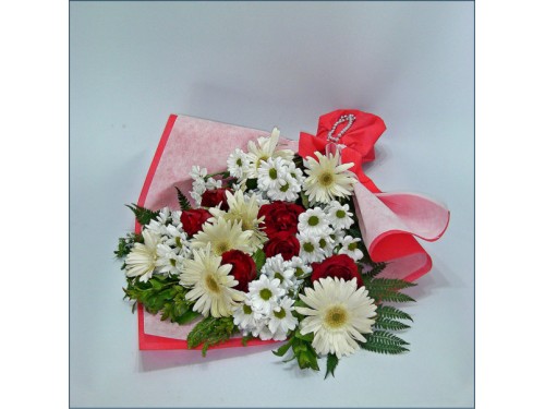 Tela ile sarılı gerbera, gül ve biçme çiçekler.
